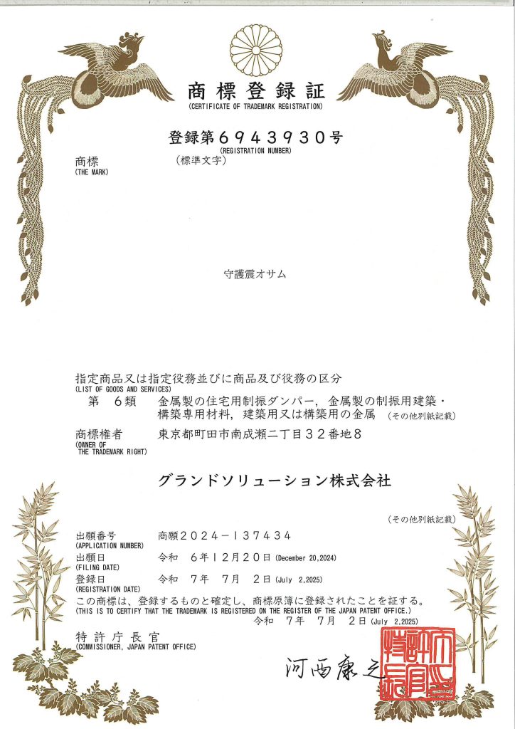 株式会社サイエンス構造と、当社グランドソリューション株式会社は共同で、「守護震オサム®」の商標を出願・登録しました。